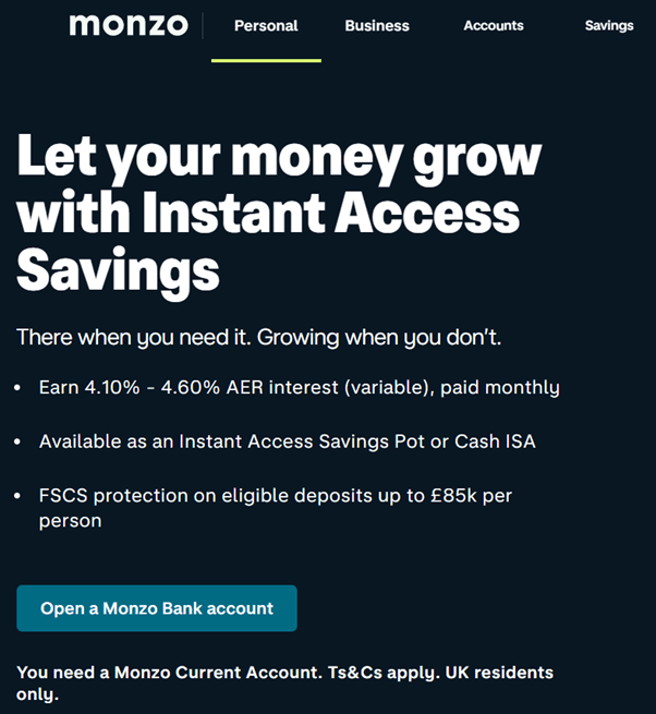 몬조는 알다시피 구독 시스템을 통해 회원의 등급을 나누고 이렇게 나눠진 등급을 통해 제공하는 혜택들을 달리한다. 하지만, 현재 무료 회원 등급인 경우에도 Instant Saving 통장을 몬조를 통해 개설할 수 있으며 4.10-4.60%의 연 이자를 제공한다. 1000 파운드를 1년 동안 넣어둔다고 하였을 때 약 41-46파운드를 이자로 돌려준다. 그리고 이자는 한 달 단위로 지급한다. 따라서 1000파운드 기준으로 3.4-3.8파운드를 매달 제공한다.